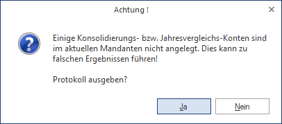 Wenn ein Jahresvergleichskonto im Kontenstamm nicht in allen Wirtschaftsjahren existiert, wird bei der Ausgabe der BWA-Mehrjahresauswertung eine Meldung ausgegeben und ein Prüfprotokoll kann mit angedruckt werden oder nicht.