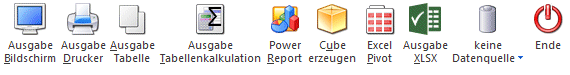 Der Button "Datenquelle verwenden" wird nur angeboten, wenn für diesen Bereich (bezogen auf den aktuellen Benutzer / Mandanten) zumindest eine private oder öffentliche Datenquelle existiert. Des Weiteren stehen die Ausgabevarianten "Ausgabe Bildschirm", "Ausgabe Drucker", "Ausgabe Tabelle" und "Ausgabe Tabellenkalkulation" nicht zur Verfügung.