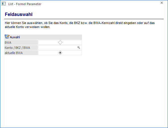 Mit dieser Funktion kann die Bezeichnung einer BWA angezeigt werden. Als Einstellung kann entweder eine BWA-Zahl (22) oder die aktuelle BWA (BWA, die in der Zeile angedruckt wird) angegeben werden.