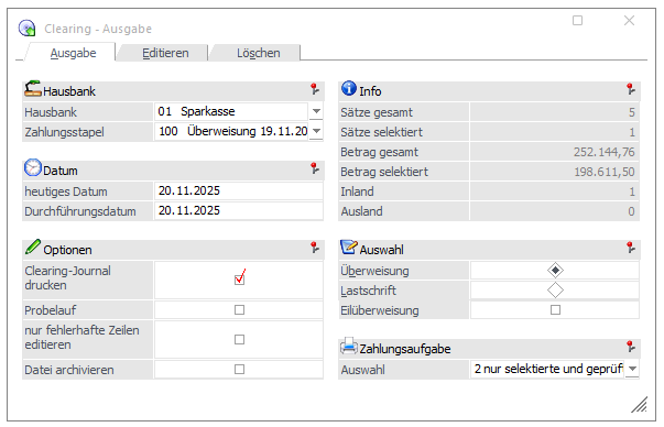 Durch Drücken der F5-Taste wird die Ausgabe gestartet. Dabei wird die im Bankenstamm hinterlegte Datei erzeugt. Zusätzlich dazu wird ein Datenträgerbegleitzettel (für die Bank, wenn die Datenübertragung mittels Diskette erfolgt) und ein Clearing-Journal (sofern die Option gesetzt wurde), auf dem alle in der Datei befindlichen Datensätze aufgeführt sind, ausgegeben.