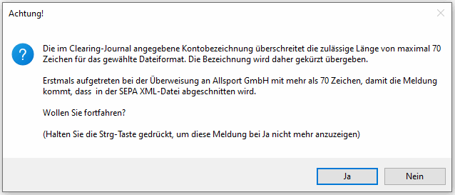Vor der Ausgabe kommt bei SEPA-Überweisungen ein Hinweis, wenn der Kontoname die maximale Länge von 70 Zeichen überschreitet und in der XML-Datei abgeschnitten wird.