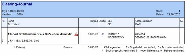 Auf dem Clearing-Journal wird dann ein entsprechendes Symbol (Rufzeichen / Ausrufezeichen) hinter dem Kontonamen ausgegeben.
