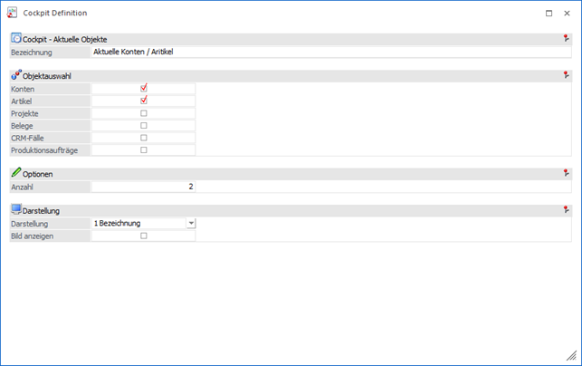 In dem Feld "Anzahl" kann die Anzahl der aktuellen Objekte hinterlegt werden. Dabei gilt diese Eingabe pro Objekt-Typ. D.h. bei der Eingabe von "5" und Aktivierung der Typen "Konten" und "Artikel" werden insgesamt 10 Kacheln gebildet.