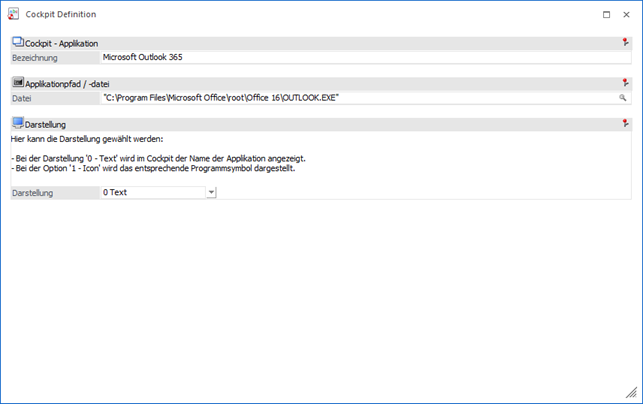 Mit dem Element "Applikation" kann direkt aus dem Cockpit heraus ein beliebiges anderes - auf dem PC installiertes - Programm (z.B. ein Textverarbeitungsprogramm oder die Bankensoftware) gestartet werden.