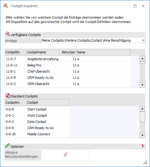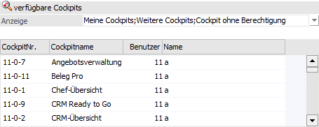 dieser Option werden in der Tabelle "verfügbare Cockpits" alle Cockpits ohne