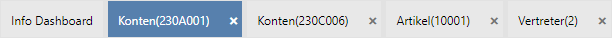 Innerhalb des Cockpits werden neben dem Eintrag "Info Dashboard" die bereits geladenen Objekte angezeigt. Ein Wechselt auf ein bereits geladenes Objekt kann durch Anwahl mit der Maustaste erfolgen.