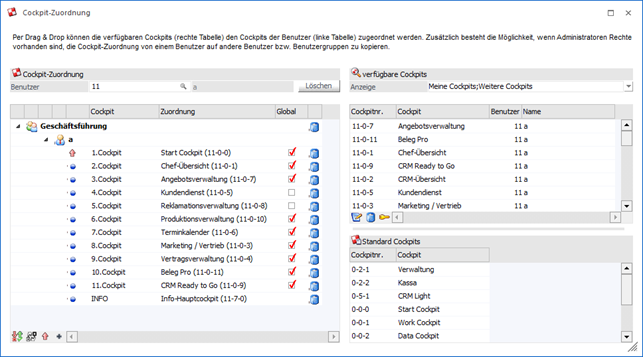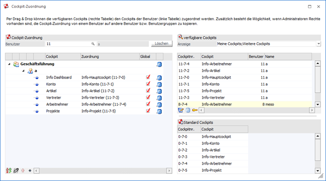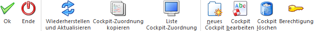 Durch Anwahl des Buttons "Ok" bzw. der Taste F5 wird die Cockpit-Zuordnung gespeichert.