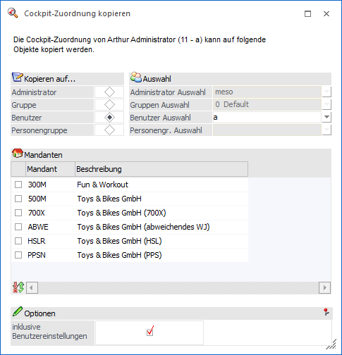 Durch die Anwahl des Buttons "Cockpit-Zuordnung kopieren" im Programm "Cockpit-Zuordnung" kann die Cockpit-Zuordnung eines Benutzers auf ein beliebiges Objekt kopiert werden.