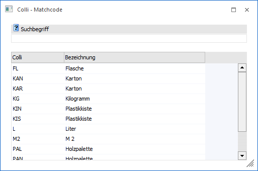 Wenn in dem Feld "Colli" ein Teil des gesuchten Collis oder der Bezeichnung eingetragen wurde und die Taste F9 gedrückt wird, dann wird diese Eingabe als Suchbegriff übernommen und die Suche direkt gestartet.