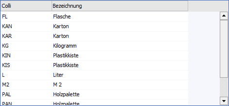 In der Tabelle werden nach Auslösen der Suche (Button "Anzeigen" oder Suchbegriff bestätigen) die gefundenen Collis mit ihrer Nummer und Bezeichnung angezeigt. Per Doppelklick oder Enter-Taste kann das ausgewählte Objekt anschließend in das Ausgangsfenster übernommen werden.