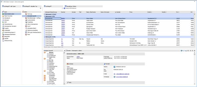 Der Vorteil des CRM-Daten-Cockpits besteht darin, dass alle Auswertungen zusammengefasst dargestellt werden können, wobei zu jedem Datenbereich auch die jeweiligen Zusatzinformationen angezeigt werden können. Von diesem Informationsbereich aus kann auch "gearbeitet" werden, z.B. können neue Workflow- oder Aktionsschritte erfasst, Informationen abgefragt oder Daten in Merklisten / Kampagnen übernommen werden.