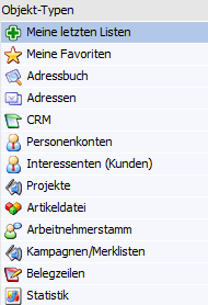 Im Bereich "Objekt-Typen" wird ausgewählt, welche Listen in der Listen-Auswahl zur Verfügung stehen sollen. Hierfür stehen folgende Typen zur Verfügung: