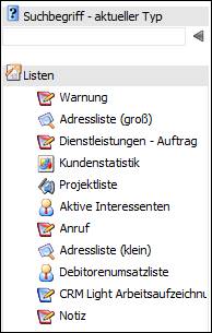 Die Suche nach Listen kann oberhalb der Objekt-Typen über das Eingabefeld "Suchbegriff - alle Typen" typenübergreifend erfolgen. Suchergebnisse werden im Bereich der Listen-Auswahl präsentiert.