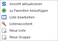Die Auswahl einer Liste erfolgt per Doppelklick, Enter, dem Button "Aktualisieren" oder über die rechte Maustaste (Funktion "Ansicht aktualisieren").