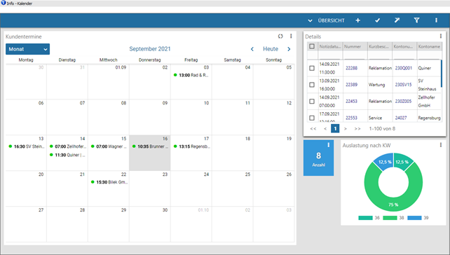 Das CRM Daten Cockpit ist in 4 Bereiche unterteilt: