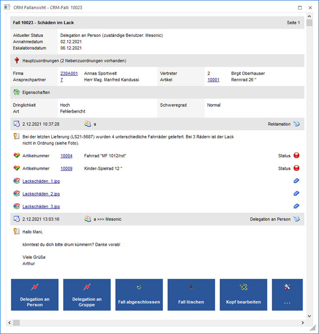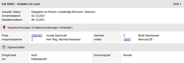 Durch Anwahl des Buttons "Erweiterte Ansicht" werden weitere Informationen zu dem CRM-Fall angezeigt.