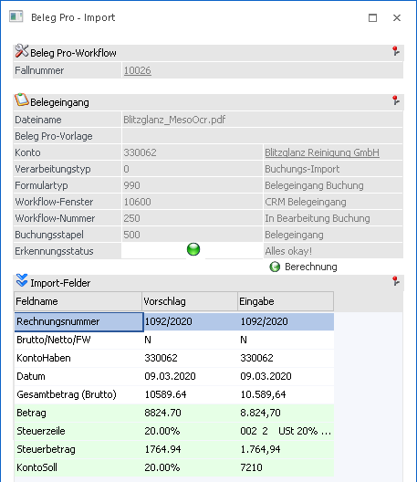 Die weitere Vorgehensweise zur Bearbeitung bzw. Übergabe können dem Kapite Beleg Pro - Import entnommen werden.