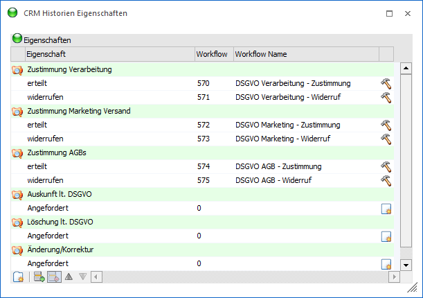 Die Standard CRM Historien Eigenschaften "Auskunft lt. DSGVO", "Löschung lt. DSGVO" und "Änderung/Korrektur" werden ohne separate CRM Aktionen zur Verfügung gestellt, d.h. es wird die CRM Aktion "555 - CRM Eigenschaft" bei Verwendung genutzt. Wenn in CRM-Auswertungen (d.h. auch bei der Auskunftserteilung) eine detailliertere Information über die Tätigkeit ausgegeben werden soll (Information "Status"), so müssen separate CRM Aktionen oder Workflow Startpunkte zugeordnet werden.