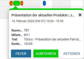Im Tooltip eines CRM-Kalender werden automatisch die Buttons "Ausführen" und "Weitere Aktionen" zur Verfügung gestellt.