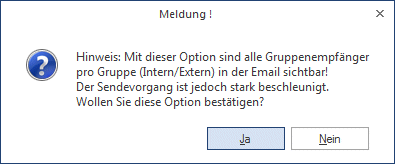 ¨ 1 Pro Gruppe (intern/extern) ein CRM-Mail: bei Verwendung dieser Einstellung werden die Empfänger der CRM-Mails pro Gruppe in ein Mail zusammengefasst. Für "interne" Benutzer wird ein eigenes Mail erzeugt, und der hinterlegte Textbaustein "intern" verwendet, und ebenso für "externe" Benutzer (inkl. Textbaustein "extern"). Wird diese Option gewählt, so wird in einem entsprechenden Hinweis angezeigt, dass pro Mail alle Mailempfänger sichtbar sind!