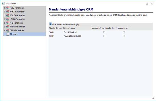 Über den Bereich "CRM-Parameter - Allgemein" wird definiert, welche Mandanten sich in einem mandantenunabhängigen CRM-Verbund befinden.
