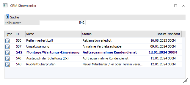 Soll die Fallansicht zu einem bestimmter CRM-Fall geöffnet werden, so kann an dieser Stelle die Eingabe der Fallnummer erfolgen.