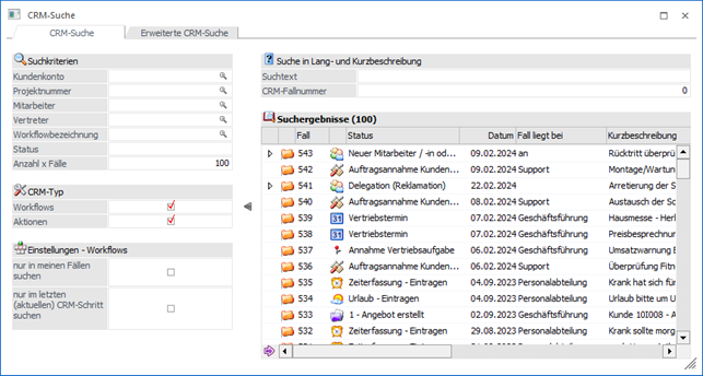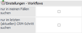 Über die CRM-Suche kann nach Workflows und / oder Aktionsschritten unter Berücksichtigung verschiedenster Selektionsmöglichkeiten gesucht werden. Das Fenster hierbei über den Menüpunkt…