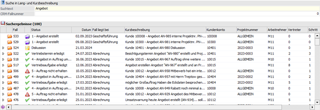 Durch Angabe der entsprechenden Werte kann die Suche auf ein bestimmtes Konto, eine bestimmte Projektnummer, einen Mitarbeiter, einen Vertreter oder einen speziellen Schritt eingegrenzt werden, d.h. es werden nun noch jene Fälle angezeigt, in denen die Suchkriterien vorkommen.
