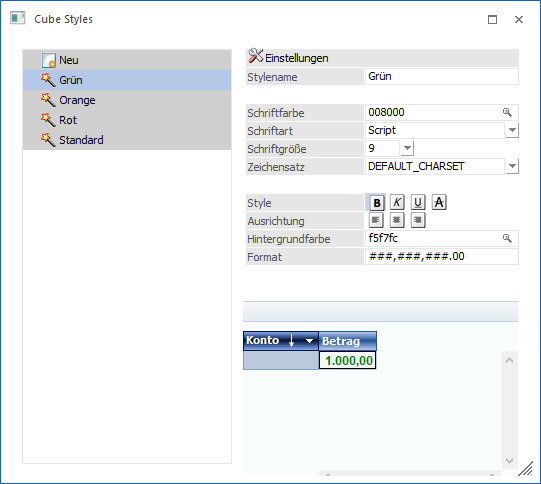 Mittels Mausklick auf den Eintrag "Neu" kann ein neuer Cube Style angelegt werden. Unterhalb des Eintrags "Neu" werden alle bereits angelegten Styles aufgeführt.