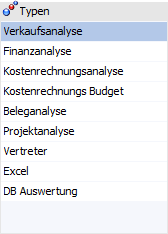 Im ersten Schritt stehen unter "Typen" neun Hauptbereiche zur Verfügung, über welche die einzelnen Cubes angelegt bzw. ausgewählt werden. Je nach Bereich stehen dabei andere Daten aus der WinLine zur Verfügung: