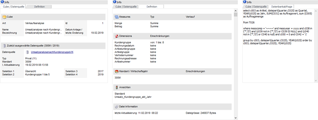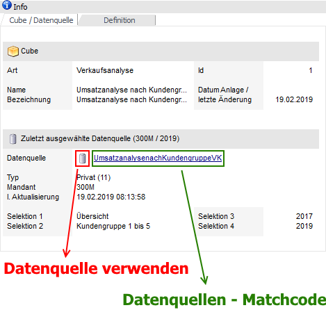Der Bereich "Info" untergliedert sich in die Register "Cube / Datenquelle", Definition und Datenbankabfrage.