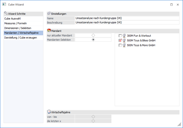 In diesem Bereich kann definiert werden, welche Mandanten und / oder Wirtschaftsjahre bei der Erstellung des Datenmaterials berücksichtigt werden sollen.