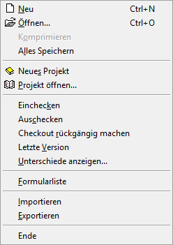 Wenn im WinLine Formular Editor das Fenster "Formularliste" geöffnet wurde und aktiv ist, dann stehen folgende Funktionen im Menü "Datei" zur Verfügung: