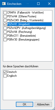 Beim Einchecken kann bzw. können die Sprache(n) selektiert werden, für die das Formular eingecheckt werden soll. Hierbei werden nur die Sprachen vorgeschlagen für welche eine MESOFORMX.MESO-Datei (X steht für die Sprache) in der Installation vorhanden ist.