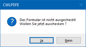 Wenn ein Formular ohne vorheriges Auschecken gespeichert wird, dann wird hierauf durch folgende Sicherheitsabfrage hingewiesen. Wenn diese Frage mit "JA" beantwortet wird, dann wird das Formular zuerst ausgecheckt und anschließend gespeichert.
