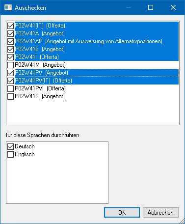 Analog zum Einchecken kann bzw. können die Sprache(n) selektiert werden, für die das Formular eingecheckt werden soll. Hierbei werden nur die Sprachen vorgeschlagen für welche eine MESOFORMX.MESO-Datei (X steht für die Sprache) in der Installation vorhanden ist.