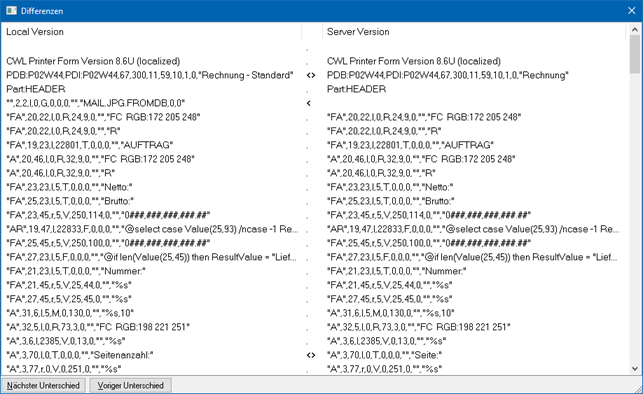 Mit den Buttons "Nächster Unterschied" und "Voriger Unterschied" kann zu den jeweiligen Einträgen gewechselt werden, wobei diese Einträge dann auch entsprechend markiert werden.