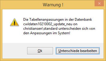 Bei der Meldung wird neben "Ok" auch der Button "Unterschiede bearbeiten" angeboten. Durch Anwahl des Buttons wird das Programm "Benutzerdefinierte Tabellen abgleichen" gestartet.