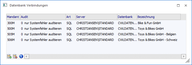 … können Eintragungen für den Aufruf von Mandanten geändert, hinzugefügt oder entfernt werden. Die Eintragungen sind notwendig, damit das Programm auf alle Mandanten, die bearbeitet werden sollen, zugreifen kann. Die Liste aller in diesem Programmpunkt eingetragenen Mandanten ist auch im Programm WinLine START beim Mandantenwechsel sichtbar. Jeder Eintrag beinhaltet die eindeutige Zuordnung zu einem Mandanten. Dadurch weiß das Programm, auf welche Datenbank es zugreifen soll und wo sich die Datenbank befindet.