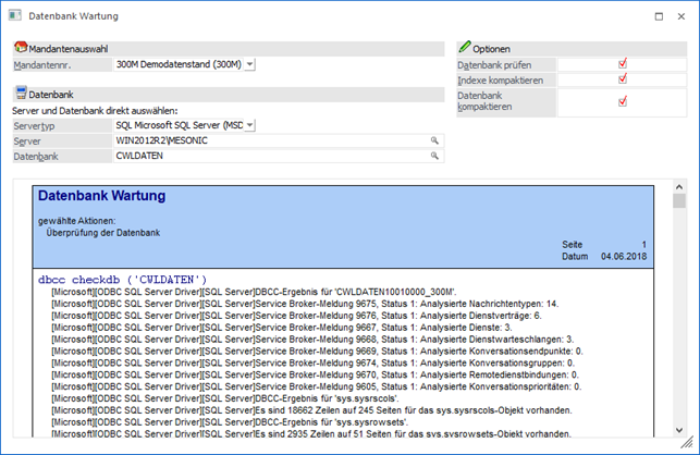 Durch Anklicken des Buttons "Ok" bzw. der Taste F5 wird die Wartung der angegebenen Datenbank ausgeführt.
