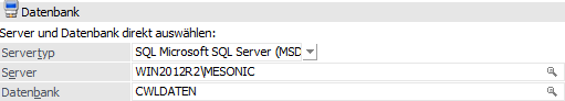 Wird aus der Auswahllistbox ein Mandant gewählt, dann werden die Felder "Typ", "Server" und "Datenbank" mit den entsprechenden Werten ausgefüllt. Wenn kein Mandant ausgewählt wird, dann können die nachfolgenden Felder individuell ausgefüllt werden (das kann auch gemacht werden, wenn ein Mandant ausgewählt wurde).