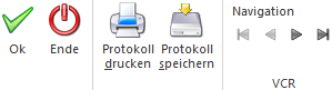 Für die durchgeführten Aktionen wird ein Protokoll am Bildschirm ausgegeben. Über die so genannten VCR-Buttons kann durch Mausklick zwischen den Seiten des Protokolls geblättert werden.