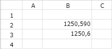 In beide Zellen wurde der Wert "1250,59" eingetragen. Bei "B2" wurde anschließend die Anzahl der Dezimalstellen erhöht und bei "B3" verringert.