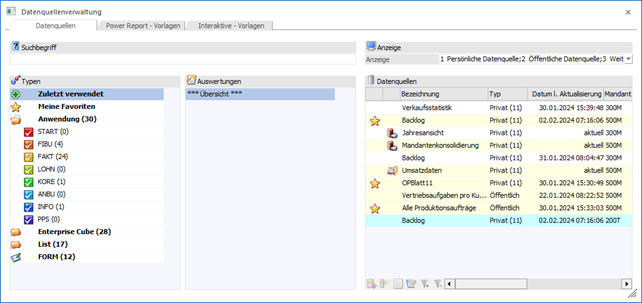 Das Programm "Datenquellenverwaltung" stellt eine Übersicht über die bestehenden Datenquellen und deren Power Report-Vorlagen zur Verfügung. Der weitere Funktionsumfang ist abhängig vom Aufruf des Fensters: