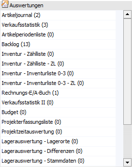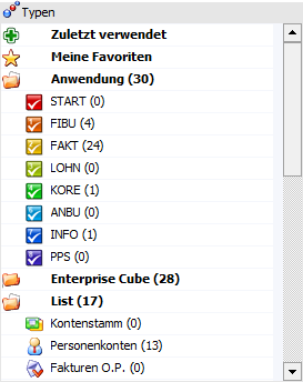 In der Tabelle werden entsprechenden der Programmberechtigungen die unterschiedlichen Auswertungstypen (Programmbereiche / Cubes / Listen / FORM) angezeigt. Durch Anwahl eines Typs wird die Tabelle "Auswertung" entsprechend gefüllt. Neben den Typen "Anwendung", "Enterprise Cube", "List" und "FORM" stehen noch folgende weitere Auswahlen zur Verfügung:
