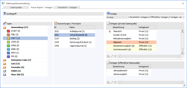 In den Tabellen werden alle Power Report-Vorlagen, gemäß der zuvor gewählten Auswertung / Formular (siehe Tabelle "Auswertungen / Formulare"), angezeigt. Handelt es sich um Vorlagen auf Basis einer Auswertung, so gibt es die Unterscheidung zwischen Vorlagen "für" private und öffentliche Datenquellen.