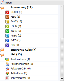 In der Tabelle werden die Vorlagen gemäß der folgenden Typen zusammengefasst, wobei durch Anwahl eines Typs die Tabelle "Auswertungen / Formulare" entsprechend gefüllt wird: