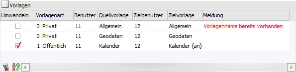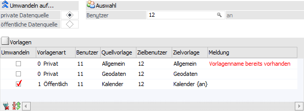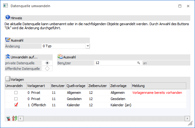 In der Tabelle werden alle Vorlagen des Benutzers, bezogen auf die umzuwandelnde Datenquelle, angezeigt. Mit Hilfe der Checkbox "Umwandeln" können die Vorlagen beim Wandeln der Datenquelle "mitgenommen" werden, d.h. der Typ der Vorlage (für private oder öffentliche Datenquelle) wird angepasst.