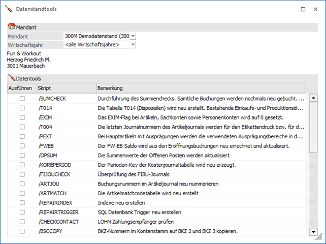 Aus der Auswahlbox kann der Mandant gewählt werden, für welchen das bzw. die Datentools durchgeführt werden sollen. Nach Bestätigung werden die Mandanteninformationen angezeigt.