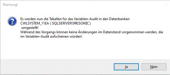 Wenn "Ja" gewählt wird, werden die Variablenaudit-Einträge in T498 aktualisiert. Währenddessen sollten keinen Benutzer in der WinLine arbeiten, da während der Aktualisierung keine Variablenaudit-Einträge in die T498 geschrieben werden können. Es empfiehlt sich daher, alle Benutzer aus der WinLine abzumelden, bevor die Abfrage bestätigt wird.
